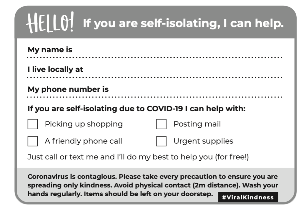 Hill, K., 2020. The Printable Letterbox Card That Helps You Support Self-Isolating Neighbours. Available at: https://www.mygreenpod.com/articles/viralkindness/ (Accessed 3 August 2020)
