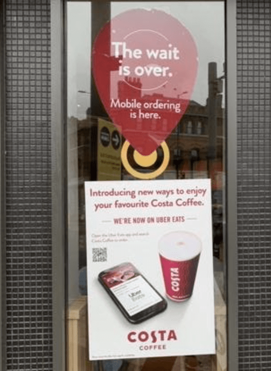 Figure 4. The signs present at the entry of Costa Coffee, indicating operation through online platforms. Credit: Rebecca Dunn