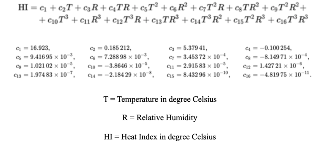 - Heat Index (apparent temperature): It is a combination of the temperature and relative humidity, which gives a notion of perceived heat. The heat index is significant for outdoor workers as it governs the precautions that they need to take. The moisture content in the air affects the rate of evaporation of sweat from the body. When humidity is high the rate of evaporation of sweat is low, whereas when the humidity is low the rate of evaporation is high. This reduced rate of evaporation causes a decrease in the body’s ability to cool itself and we feel hotter.