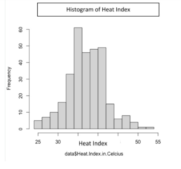 First, the rough distribution and spread of the data was analysed, beginning with plotting the histogram of the heat index values (Fig. 1). The mean, median, and mode were used as measures of the central tendency of the data.