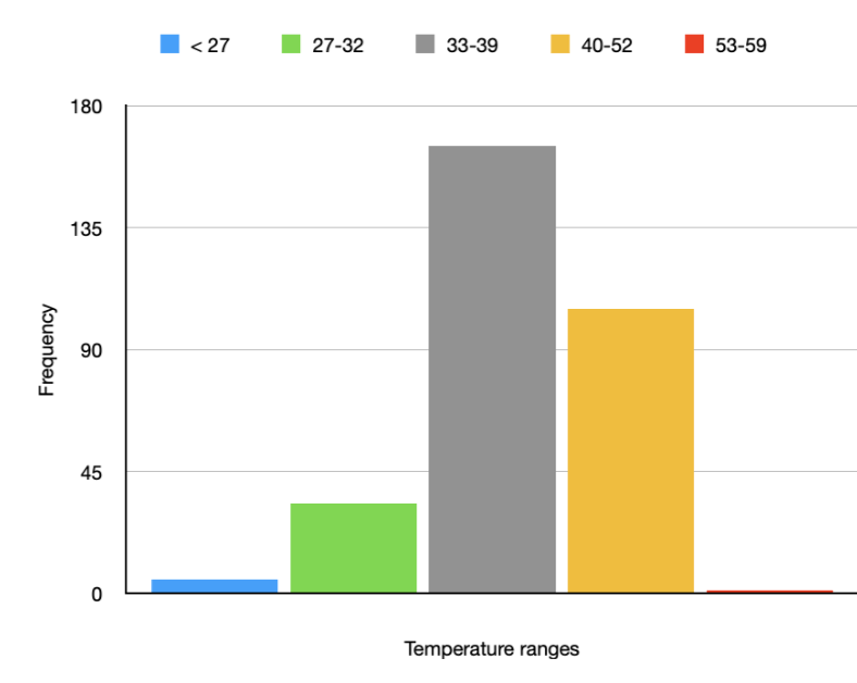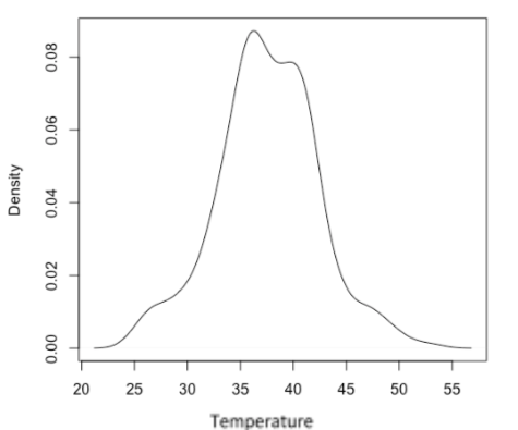 The mode of the data is 36℃. To further get an idea of the central tendency of the data the median of the data was calculated as well. The median = 37℃. Next, we will calculate the mean of the data: