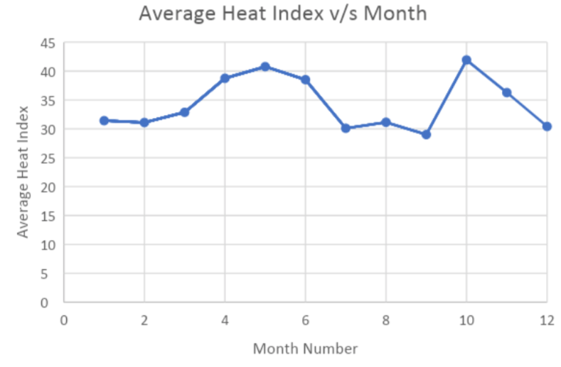 In Figure 4, it is clear that there is a spike in the average heat index in the month of October that exceeds the average heat index in the Summer season in months like April and May.