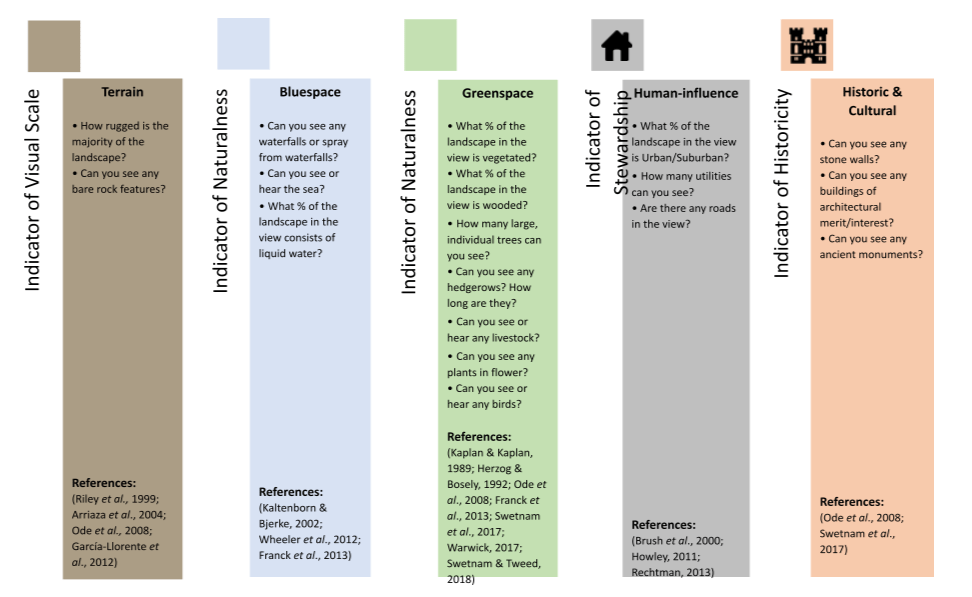 The VQI recognises five thematic components: terrain, blue-space, green-space, built and historic. Each of these thematic components are further divided into measurable landscape components (Figure 1), with positive and negative impacts on the visual landscape. A full break down of indicator questions and visual quality scores can be found in Appendix 1. In their raw form, the results of the five thematic landscape components set out in Figure 1 are not equal due to differing number of parameters within each component (Swetnam et al., 2017). To move from raw data to the Visual Quality Index score, the values are totalled, then scaled and weighted to provide an index for each site between 0 and 1 (Swetnam et al., 2017). With the weighting attached for each landscape component, the overall landscape is given an objective visual quality score with a final possible value ranging from 0 (low quality) to 1 (high quality).