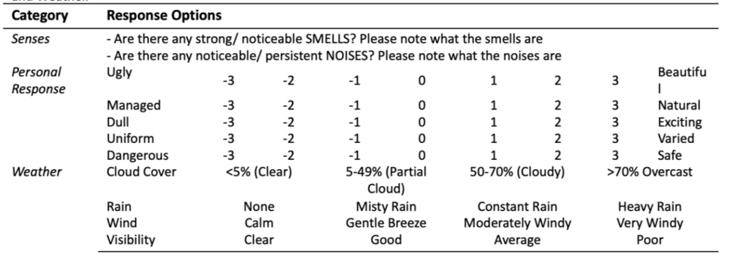 As discussed earlier, there is a substantial body of research on the aesthetic appeal of landscapes. In a similar vein to (Swetnam & Tweed, 2018) this version of the VQI required to record measures of personal landscape appeal as well as ephemeral landscape aspects for example, noticeable smells, sounds and weather conditions (Table 1). Whilst all respondents were required to complete this, it was kept separate from the overall score of the VQI to maximise the VQIs objectivity. Whilst perceptual processes are an integral aspect of landscapes (Daniel, 2001); the inclusion of a preference survey separate to the VQI meant the relatively objective VQI score could be compared against subjective and emotional responses to the landscapes. This would enable it to be determined whether landscapes that were afforded a high visual quality score were also deemed to be more attractive (Ode et al., 2008; Ode et al., 2009).