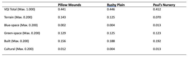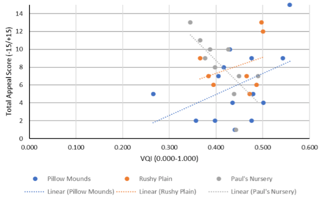 A final use of the VQI has been its use with modelling data analysis skills. At a simple level, students can practice GCSE level data analysis through the presentation of graphs and mathematical skills such as Mean and Range. As illustrated in this study, when ranked by mean VQI score, the results show Rushy Plain had the highest landscape quality with a VQI of 0.446, which was then closely followed by the Pillow Mounds with a VQI of 0.441 and Paul’s Nursery with a VQI of 0.412 (Table 2). Further analysis could be conducted by students, highlighting the breakdown of the various landscape components along with the range in mean VQI responses only being 0.034. From this, conclusions can be made by some students that the landscapes have a similar visual quality.