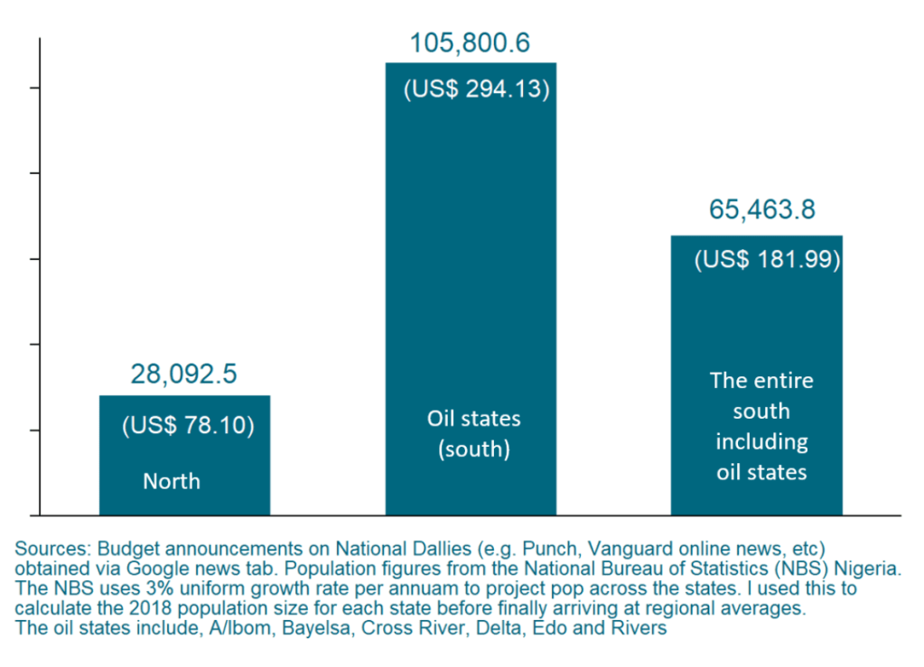 The south has 2.3 times the level of spending on its citizens when compared to the north. However, much of the rift in spending is caused by the oil states in the south who spend 3.7 times more on their citizens when compared to the northern regions. This is down to oil and its importance to the Nigerian economy. This rift in spending shows the difference in ability to support those on the lowest incomes but also to provide infrastructure and facilities to aid future development.