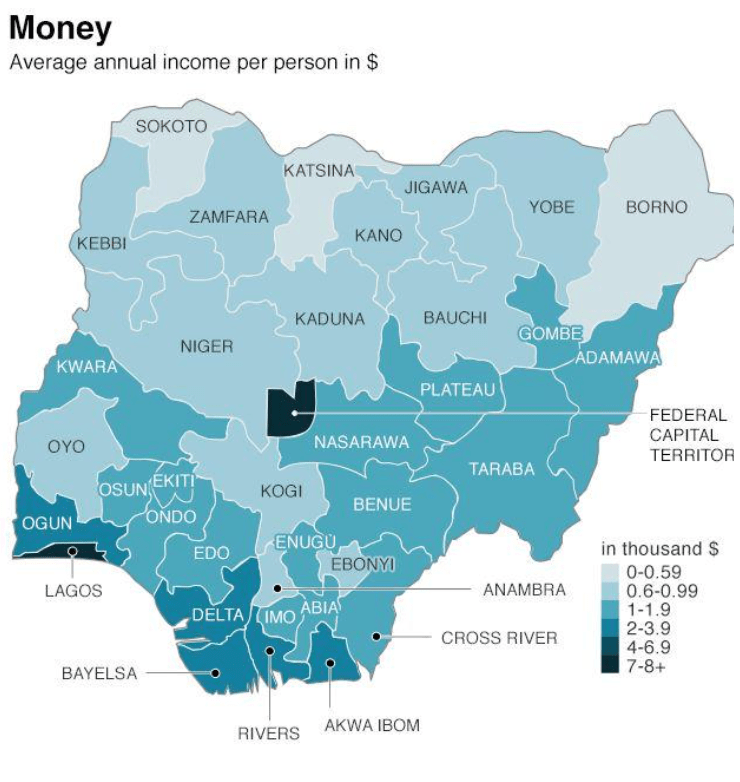 Inclusive development is that which includes ‘marginalized people, sectors and countries in social, political and economic processes for increased human well-being, social and environmental sustainability, and empowerment’ (Gupta et al., 2015: 546). The main area for marginalisation is the north and its inhabitants, where there are the most marked differences in income (shown in Figure 5). But Lagos, a city of 14 million, provides ‘more than 50% of non-oil GDP’4, and thus there could be economic marginalisation of areas beyond the city as it provides such a nucleus for the economy. Therefore, there is a spatial inequality due to the lack of inclusive development with Lagos at the core of the economy.