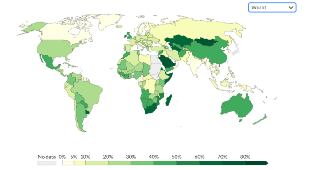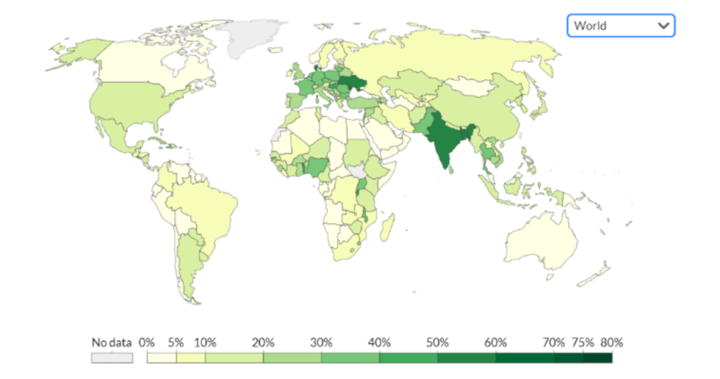 One reason why countries import products is because they do not have enough space to produce the foods, and space is an issue worldwide. One third of the Earth’s land is used to grow food, as the population grows, we need to find space to grow more food, or methods of growing the same amount of food in a smaller area. Figure 2 shows that the country where the highest percentage of land is used for agriculture is Saudi Arabia, whose main products are dates, tomatoes, and wheat, as well as being the world’s largest livestock farmer. The country where the lowest percentage of land is used for agriculture is Greenland, followed closely by Singapore, which is a very small country with a high population density, meaning that they cannot devote lots of land to agriculture.