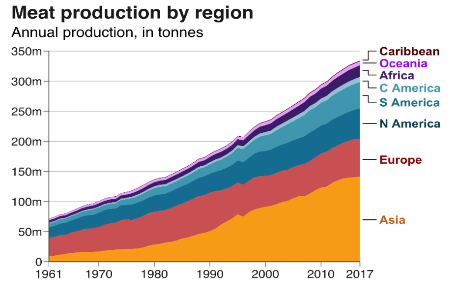 Figure 5 shows that globally, the most meat is produced in Asia, which aligns with Figure 3, which showed that many countries, like Mongolia and Saudi Arabia use nearly all of their land for animal rearing.