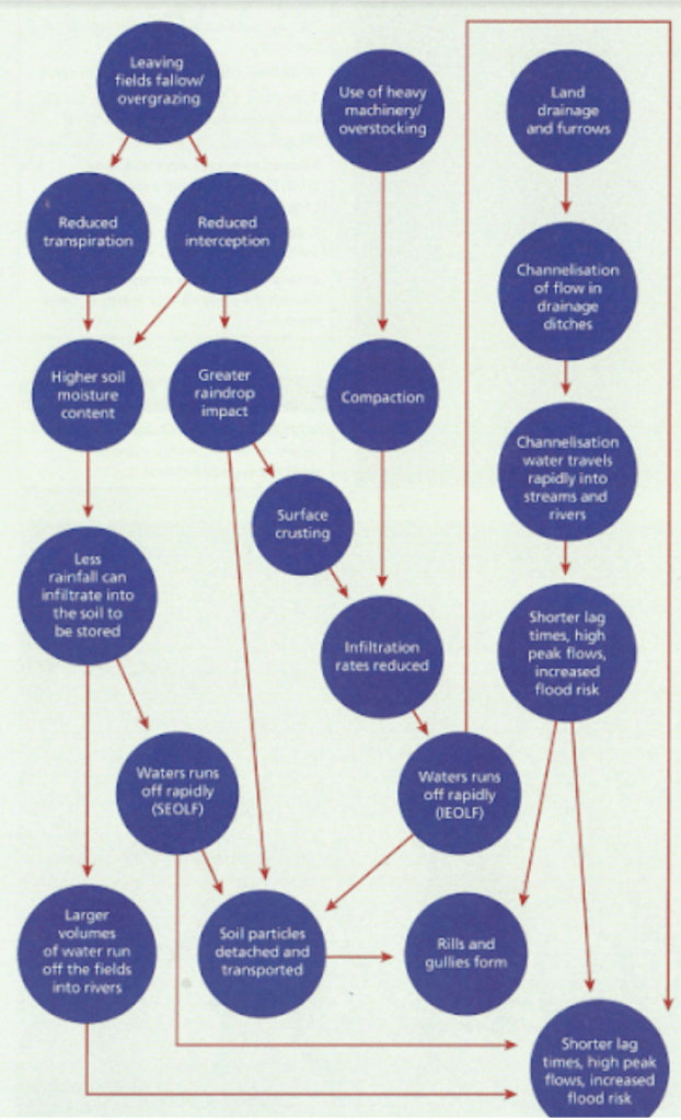 As well as this, the agricultural industry is causing between 70 and 80% of the worlds water withdrawals (Garnet, 2013). This is largely due to fertilisers used in agriculture, which have then washed into water supplies which has then increased the salinity of these water sources, rendering them unusable. Figure 6 shows the how the different aspects of farming can have severe negative impacts on local water systems, leading to floods caused by rapids surface runoff and largely oversaturated soils. This shows that in some instances, arable farming can have a more negative impact that animal rearing, since arable farming is largely damaging surrounding soils, which is impacting water stores that surround these farms.