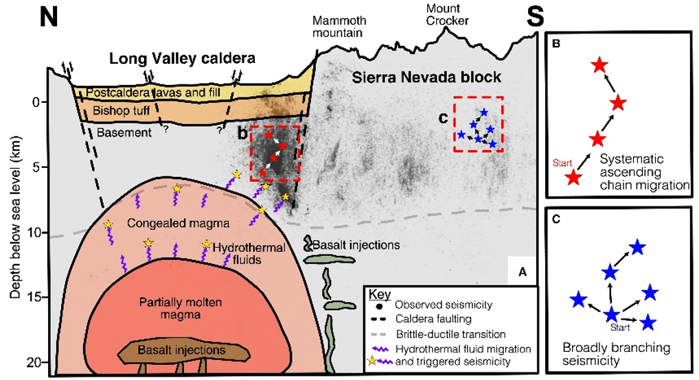 Figure 7: A diagram to show the subsurface geomorphology of the Long Valley Caldera. Source: https://www.science.org/doi/10.1126/sciadv.abi8368.
