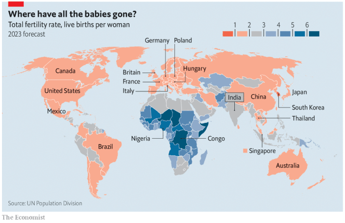 Figure 2: Choropleth map of forecasted fertility rate by country for 2023 (The Economist, 2023)