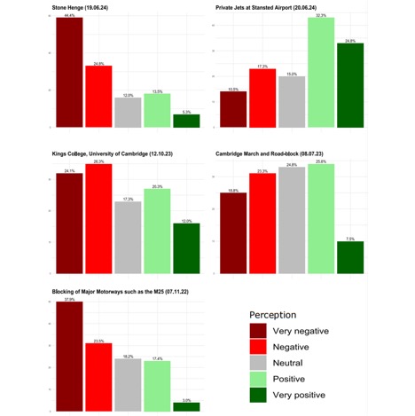 Conversely, according to Feinberg et al.’s (2020) Activists’ Dilemma, actions perceived negatively, such as the blocking of the M25 and the spraying of Stonehenge, are those which are likely to have been seen as immoral, unnecessarily disruptive, or performative due to their unclear logic. These extreme actions are more likely to be perceived as damaging either property or inducing harm to people, leading to a negative perception from the student population. This contrasts with the positively viewed Cambridge march and roadblock, which were likely perceived as peaceful and less harmful to people and property.