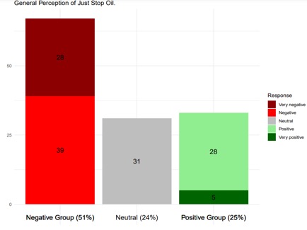 The final factor to consider regarding the perception of JSO is the nature of the specific campaign. Notably, the most positively received protest action by JSO was spraying private jets at Stansted airport (with 57.1% perceiving them positively) (Figure 4), providing evidence that campaigns are more likely to garner support from the student population if they are seen as directly addressing the movement’s core issues (Badullovich et al., 2024).