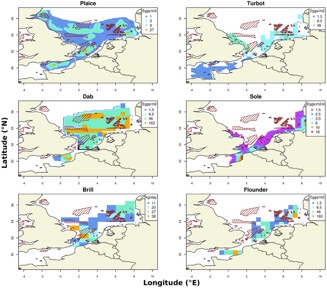 Figure 1. The overlap of six flatfish spawning grounds (plaice, turbot, dab, sole, brill and flounder) with offshore wind farms (depicted by hatched areas) shown in biomass or egg density (Barbut et al., 2019).