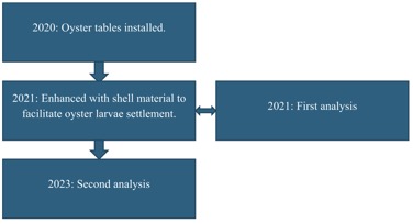 For instance, the Blauwwind consortium of OWF developers, constructors and operators are conducting field experiments within the Borssele III and IV OWFs in the Dutch North Sea to establish native oyster reefs and promote ecological development, with 2400 adult flat oysters deployed in 2020 (Reuchlin et al., 2021). Pilot restoration projects of the European flat oyster conducted by Bos et al. (2023) found successful growth and reproduction of translocated oysters from Ireland, Norway and other regions of the Netherlands in OWFs. Blauwwind (2023) provided updates on this project in that 88% of the oysters were ready to reproduce and there were 128 species in total identified at the wind farm encompassing the increase in species richness. Figure 4 summarises the general timeline of this restoration project.