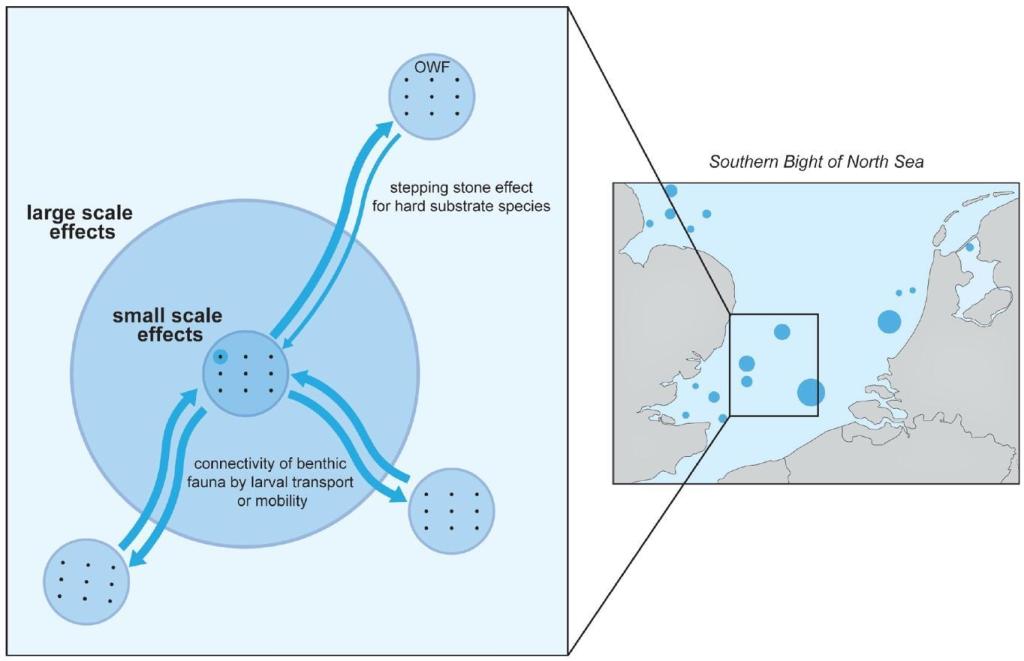 Figure 3. Illustration of how OWF artificial reefs create small- and large-scale effects by the connectivity of hard substrate species via the ‘stepping stone’ effect (Degraer et al., 2020).