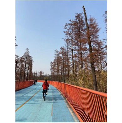 Our journey starts with Jincheng Park. Occupying 166 hectares of land, the park is located in one of the most developed regions of the city. The aim of encouraging human activities is evident in Jincheng Park. Even though there are various kinds and larger areas of trees, a bike lane separates the consistent network of tree growth. People ride on the lane for exercise with trees just beside them. This is primarily because the park bears the responsibility of attracting more residents to the area, so that the housing properties can be sold, the shopping malls nearby can have more sales, and the economy can be boosted. As a result, it is more dedicated to recreation and human engagement. This indicates the entrepreneurial analytic of rewilding in cities that inevitably concerns the demand of capital and economic growth (Turnbull et al., 2025). In the meantime, discourses that present nature as increasing wellbeing (Turnbull et al., 2025) are also adopted on this occasion by encouraging citizens to participate in exercises such as biking and jogging in this dedicated area. The rewilding here is not solely constructing a natural environment but bears complicated efficacies such as urban entrepreneurship and increasing resident health. This proves the social function of rewilding projects in the urban system.